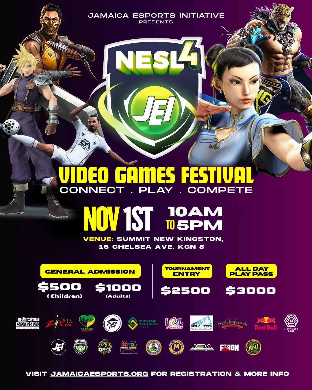 The NESL4 Season Finale happens on Nov 1, 2025 at The Summit, Kingston. Enjoy esports tournaments with a $300,000 JMD prize pool, plus the Roblox Experience and Junior EA FC26 Tournament for kids. Explore VR, Racing Simulators, Casual Gaming, Cosplay, and Artist Alley. Connect. Play. Compete.